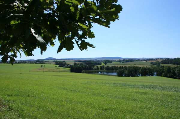 Sie überqueren die B170 und gehen auf einem geteerten Fußweg weiter. In der Ferne sehen Sie den Luchberg (links) und im Grund glänzt der Hafterteich. Am Wegrand befinden sich Lehrtafeln mit Tieren und Pflanzen des Waldes, aufgestellt von einem Tierfriedhof in der Nähe. |
