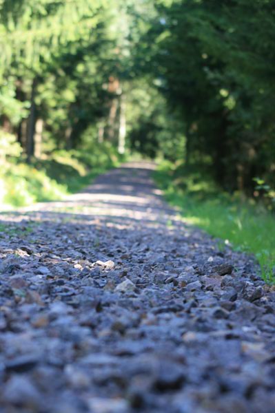 Der geschotterte Weg führt Sie geradewegs durch dieses kleine Waldgebiet.