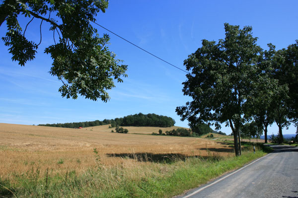 Haben Sie das Zscheckwitzer Holz verlassen, treffen Sie auf eine Landstraße. Sie müssen ihr rechts nach Hermsdorf folgen. Der bewaldete Hügel vor Ihnen ist der Hermsdorfer Berg.