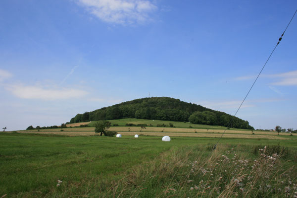 Nachdem Sie in Lucha auf die "Alte Eisenstraße" nach rechts abgebogen sind, gelangen Sie hinaus auf die Felder. Von hier aus sehen Sie nochmals den Luchberg. in entgegengesetzter, südlicher Richtung ragen Geisingberg und Mückentürmchen hervor.